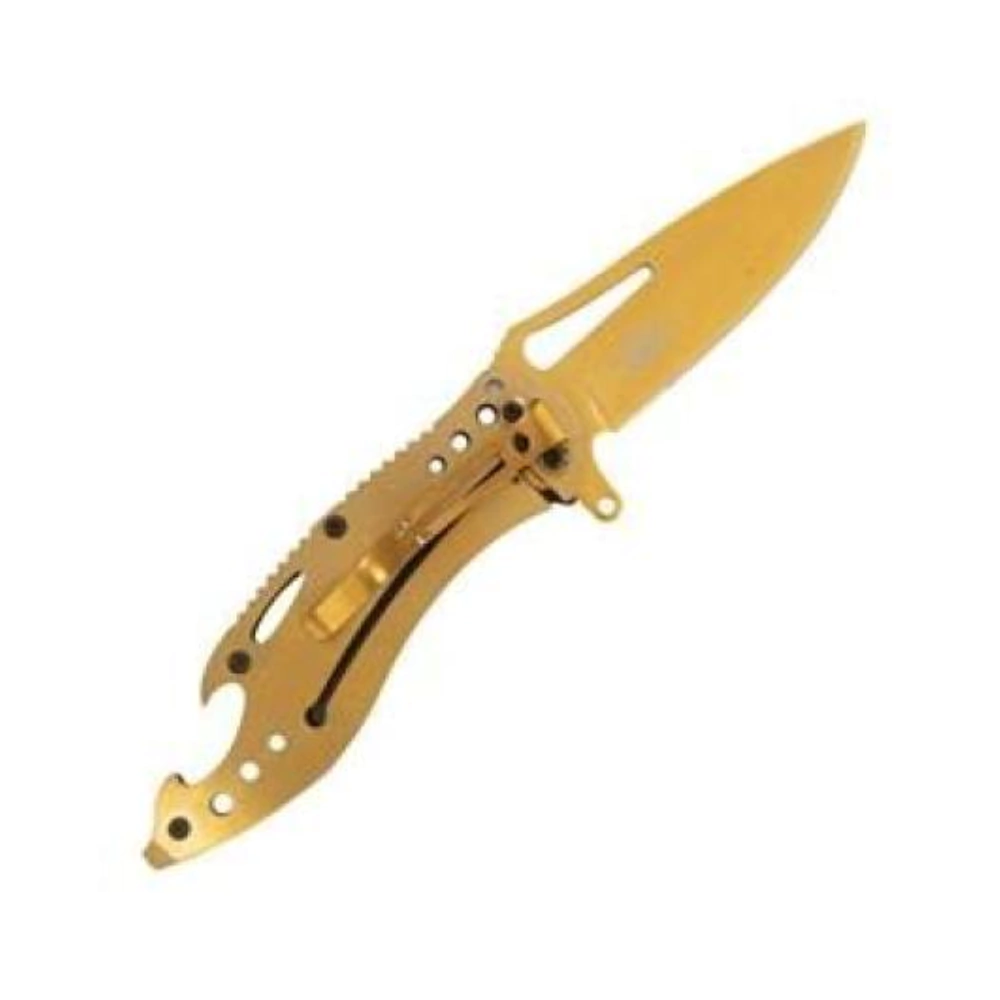 Material: Lâmina de aço inoxidável com acabamento dourado.